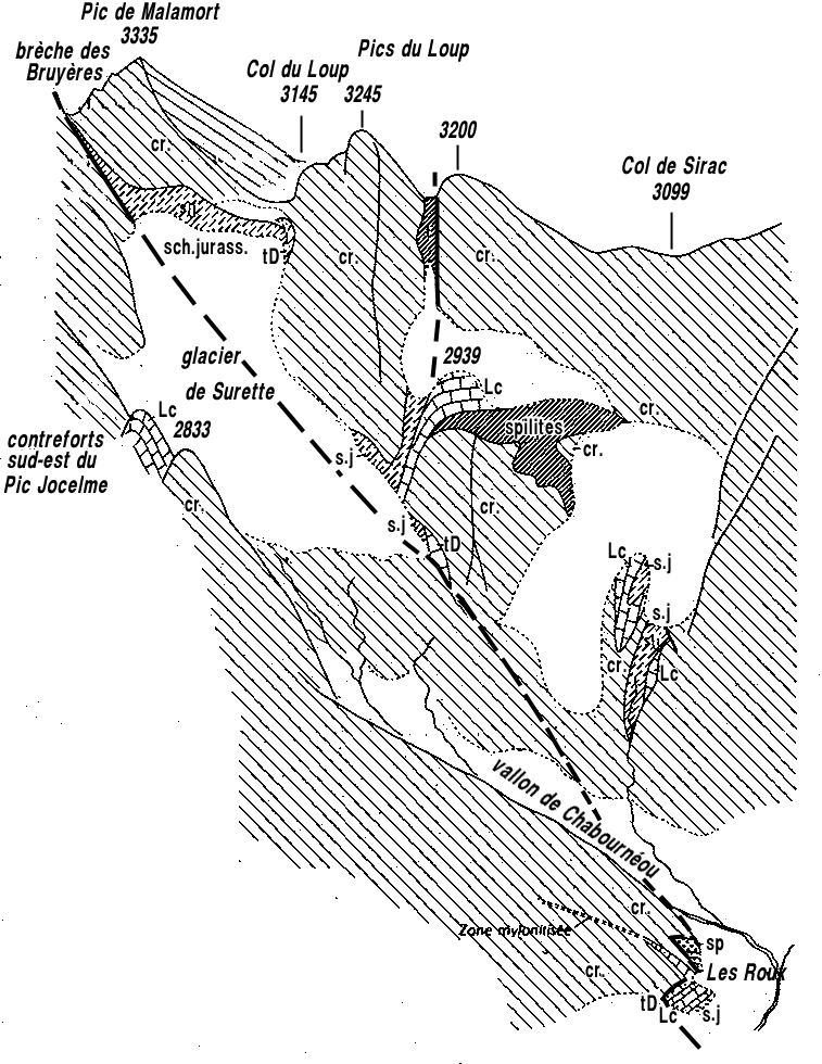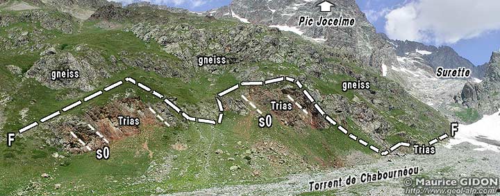 La cassure principale, que suit le glacier de Surette, mérite d'être appelée faille de Chabournéou car elle détermine visiblement, en aval du glacier, le vallon de ce nom. C'est ce qu'indique notamment la présence en fond de vallon de la bande de Trias des rochers des Roux. Ces affleurements sont plaqués en pied de pente contre le cristallin de rive droite du vallon (peu en amont du refuge de Chabournéou) et la disposition des strates y est franchement oblique au tracé du contact : ils représentent un chapelet de copeaux tectoniques (des "navettes"*) jalonnant le tracé du couloir de faille.