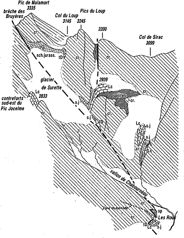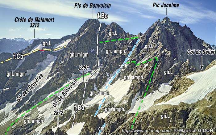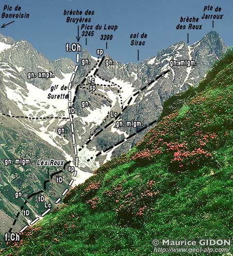 La bande amphibolique du Pic de Bonvoisin s'interrompt au niveau du glacier de Surette et y fait place, du côté méridional, à un ensemble formé par les migmatites du Sirac. Cela correspond au passage d'une zone de cassure orientée W-NW - E-SE. Cette dislocation, qui constitue une importante frontière au niveau du socle cristallin, est par ailleurs soulignée par l'interruption de plusieurs bandes d'affleurements de terrains sédimentaires, pincés de façon apparemment assez capricieuse, qui jalonnent plusieurs plans de cassure différemment orientés.