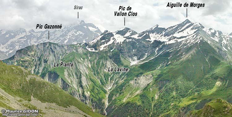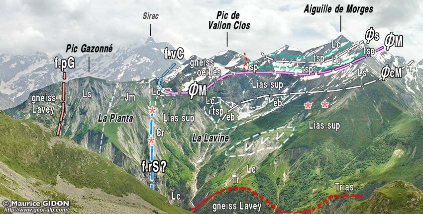 Le chevauchement de l'Aiguille de Morges est le principal de ces accidents. Il prend naissance du côté nord de la crête de ce sommet, dans le versant nord du Pic de Vallon Clos, où il concerne également le cristallin formant le sommet de ce nom, qu'il fait reposer sur les schistes du Toarcien-Aalénien de La Lavine.