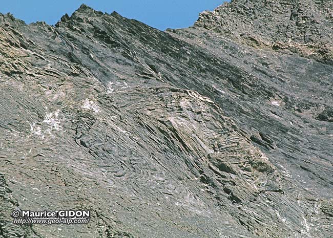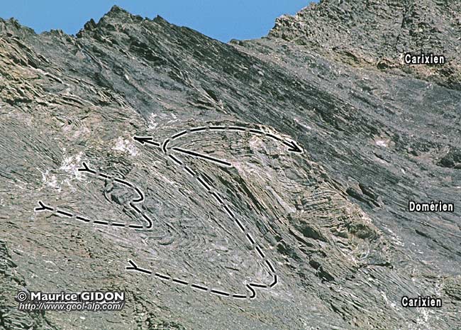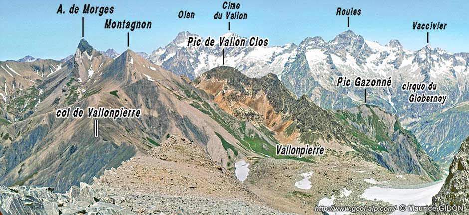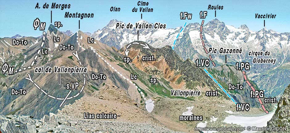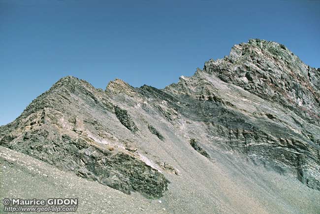 En fait la surface de chevauchement de l'Aiguille de Morges recoupe en biseau le flanc normal du synclinal de Vallonpierre, qui affecte cette "écaille de Morges", de sorte que le cristallin du Pic de Vallon Clos, qui appartentient au flanc NE de ce synclinal n'est présent que dans la partie septentrionale de l'écaille (voir le seond cliché de la présente page). Cela suggère (mais sans le démontrer) que le chevauchement est sans doute postérieur au plissement. |
