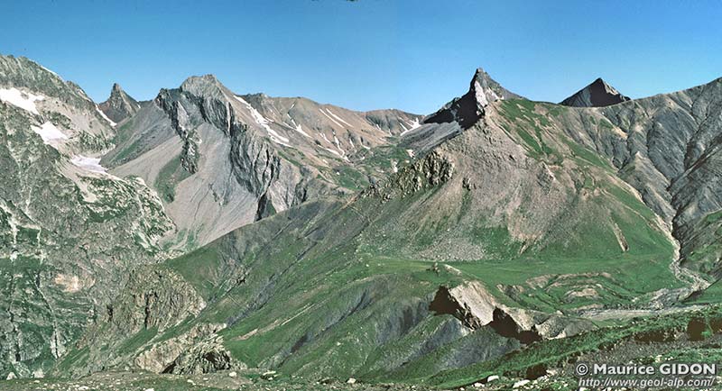 ![]() Le versant sud de l'Aiguille de Morges vu du rebord méridional des prairies du Vallon Plat. ØM = chevauchement principal de l'Aiguille de Morges ; ØcM = chevauchement satellite, du col de Morges ; ØcC = chevauchement du col de Clapouse ; f.Cl = faille du vallon de Clapouse ; vers l'ouest (arrière gauche)qui redouble la base de la série sédimentaire au col de Clapouse. Cette dernière cassure recoupe en biseau la précédente au débouché aval du Vallon Long, au creux duquel la barre du Lias calcaire de l'Aiguille de Clapouse se termine en sifflet (sur le cliché cet endroit est masqué par la crête herbeuse qui sépare le Vallon Long du Vallon Plat). (voir le revers de ces crêtes à la page "Navette") |