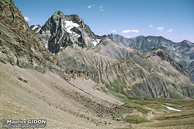 Le fait que le contact entre cristallin et sédimentaire s'avère toujours assez fortement penté vers l'intérieur du massif montre que cette couverture sédimentaire n'est pas simplement posée en chapeau : elle remplit une dépression tectonique plus ou moins en forme de cuvette que l'on dénomme le synclinal de Morges, même si sa structure est plus complexe que ne l'évoque ce terme. Le versant septentrional de ce "synclinal" est examiné à la page "Vallon Clos" et son extrémité occidentale à la page "Navette". |