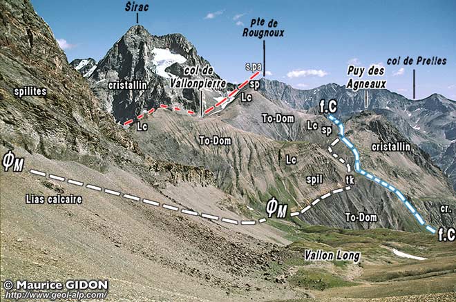 ![]() Le versant méridional de la crête Morges vu de l'ouest, depuis le col de Morges. La falaise de premier plan à gauche est constituée par la lame de spilites triasiques qui se poursuit sur la gauche jusqu'à former le sommet de l'Aiguille de Morges ; on y distingue des rubanements rouges de cinérites et d'argilites. Le pointement de Lias calcaire qui émerge de l'éboulis, en bas à gauche, appartient à la lame imbriquée immédiatement inférieure à l'écaille principale de Morges. s.pa = surface de la pénéplaine anté-triasique, renversée (= "chevauchement" du cristallin du Sirac sur les terrains sédimentaires) ; ØM = surface de chevauchement de l'écaille principale de Morges ; f.C = faille du col de Clapouse. On voit sur ce cliché que f.C tranche en biais ØM, peu en contrebas nord du col de Gouiran (à gauche du Puy des Agneaux). Cette cassure se poursuit plus à l'est, où elle tranche à son tour ØS, peu au delà du col de la Vallette, fermant ainsi la bande méridionale des affleurements sédimentaires du "synclinal" de Morges. |