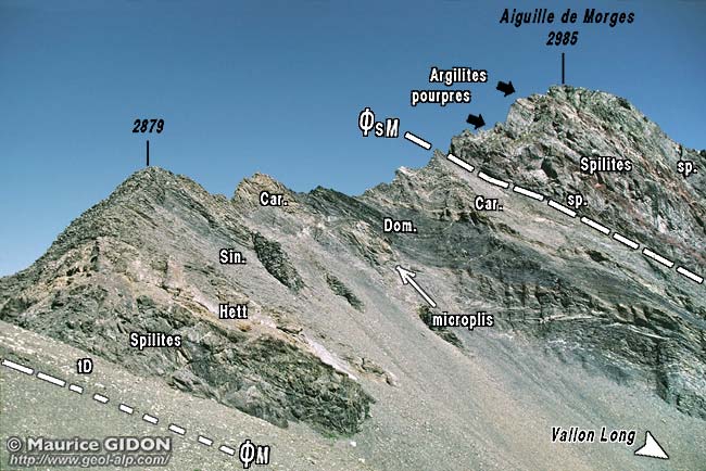 C'est au flanc sud de ce pli qu'appartient le sommet même de l'Aiguille de Morges. Il est constitué par une dalle rocheuse assez fortement redressée composée de plusieurs couches de spilites triasiques. La plus basse de ces dernières repose directement, sans soubassement gneissique, sur les calcaires et schistes du Lias qui représentent l'autochtone relatif du chevauchement.