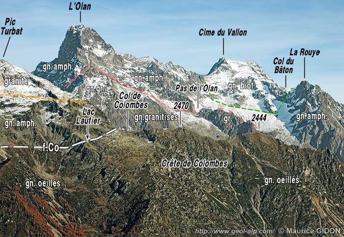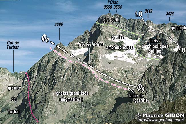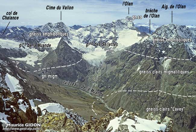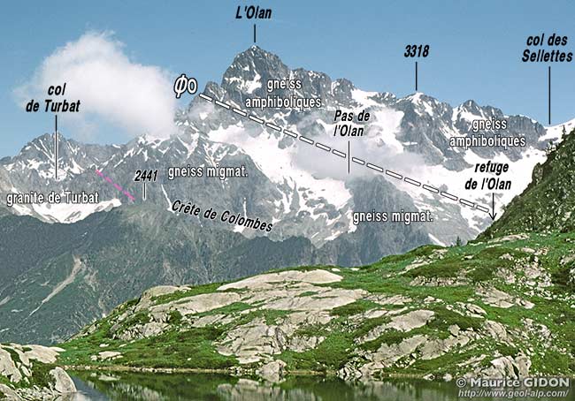 Toutefois une particularité est qu'il s'agit de gneiss amphiboliques et que ceux-ci sont, sur le versant sud, dénués de leur habituelle semelle de gneiss du type Lavey : ils y reposent directement sur un substratum granitique (granite de Turbat coiffé de gneiss granitisés *).
