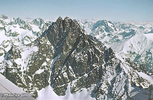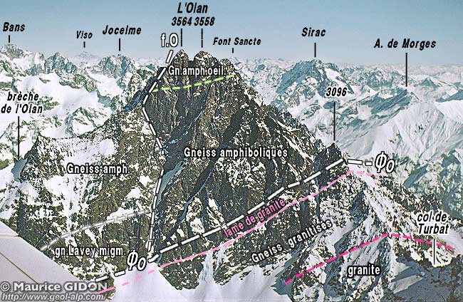 Une autre faille importante, appelée ici "faille verticale de l'Olan", détermine la face nord du sommet septentrional (3564) ainsi que le grand couloir nord de la face ouest. Sa surface de cassure est presque verticale, avec un rejet vertical de plus de 100 m, et orientée NW-SE, de sorte que son tracé traverse la crête orientale à la brèche Escarra pour courir ensuite vers le sud-est, à flanc de versant méridional de cette crête, jusque sous la Cime du Vallon et au delà. On voit bien, dans la face ouest, que cette cassure est plus ancienne que le "chevauchement" de l'Olan car elle bute contre lui sans le décaler. |