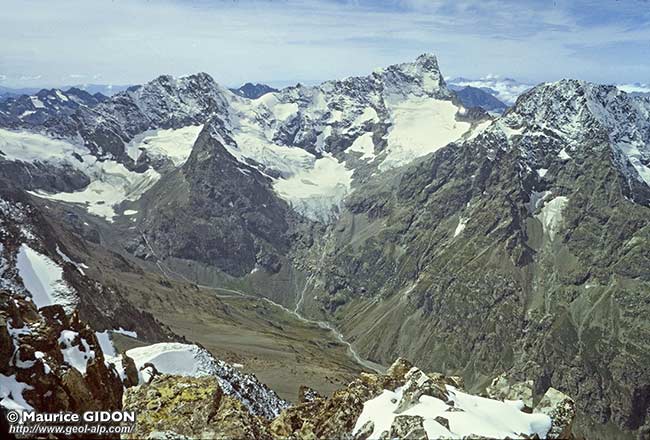 Enfin du côté sud, sur son versant Valgaudemar, sa crête sommitale domine de 500 m les hautes pentes des cirques glaciaires suspendus de la rive gauche (orientale) du vallon des Clots (au creux de l'un desquels est bâti le refuge de l'Olan).