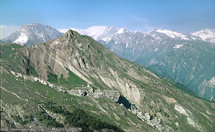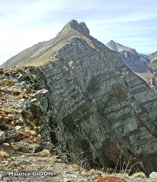 Pour l'un comme pour l'autre de ces sommets leur partie culminante comporte un chapeau de matériel jurassique, coiffé de Nummulitique, qui se rattache au chapelet des klippes* de l' écaille ultra dauphinoise de Soleil Bœuf. Ces petites klippes reposent sur les Grès du Champsaur autochtones par l'intermédiaire d'un niveau de schistes pélitiques qui ont par places l'aspect de Terres Noires, car ils sont riches en débris de ce matériel, mais qui contiennent des petits lits de grès : il s'agit sans doute d'un olistostrome*, correspondant au terme ultime de la sédimentation nummulitique, associé à l'avancée "humide" de cette écaille*, sur les sédiments en cours de dépôt.