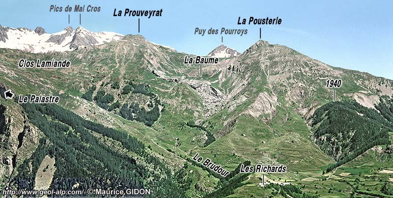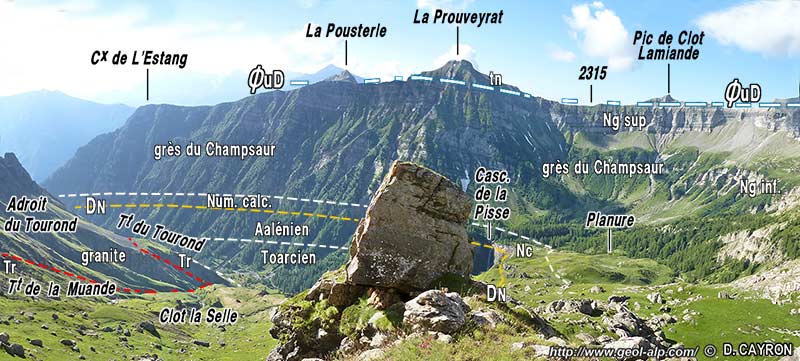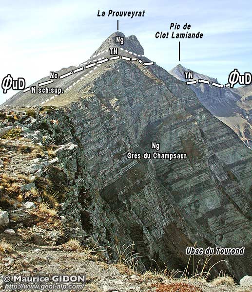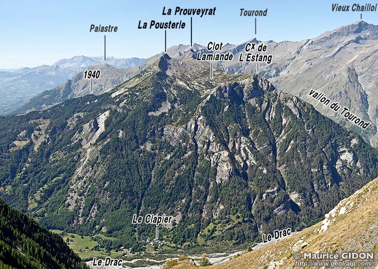 Les deux sommets mineurs de La Prouveyrat et de La Pousterle accidentent l'arête orientale du chaînon de Soleil Bœuf avant qu'elle se termine du côté est, tranchée, à partir de la Croix de l'Estang, par la vallée du Drac Blanc. Le sommet de la Prouveyrat tombe directement, du côté nord, sur le ravin du Tourond par des abrupts quasi continus qui sont presque entièrement constitués par l'épaisse succession de Grès du Champsaur (voir cliché plus loin dans la page), tandis que celui de La Pousterle se greffe en retrait sud de la crête (dont il est séparé par le petit vallon de Clot Lamiande).