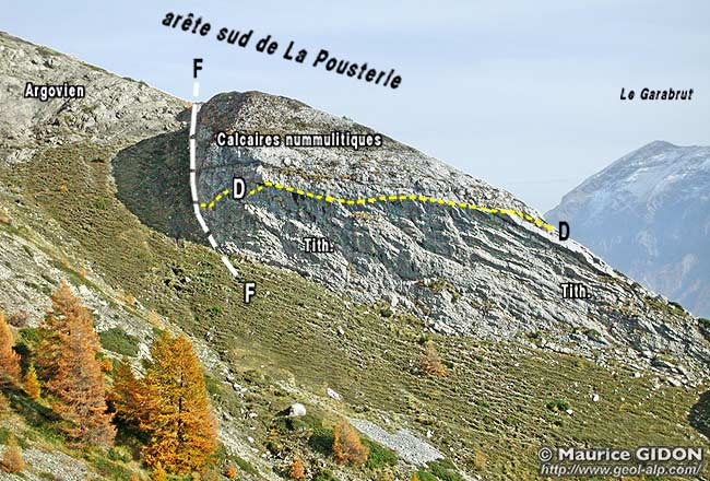 ![]() un détail de l'arête sud de la Pousterle (altitude 2000 au dessus de la cabane de la bonne Herbe) vu de l'ouest, depuis le sentier de La Baume (coin inférieur droit du cliché d'ensemble). Le Mésozoïque qui chevauche sur les Grès du Champsaur par le chevauchement de la Pousterle est affecté de diverses complications de détail : on voit ici une faille extensive (F) qui abaisse son compartiment méridional (droit) et, dans ce dernier, le repos des calcaires nummulitiques sur le Tithonique (dont les bancs sont plus fortement pentés que la surface de discordance D) |