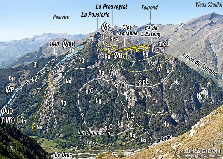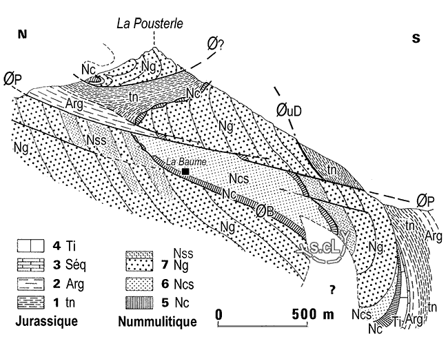 - Dans une étape ultérieure l'ensemble a été reployé en un synclinal d'axe E-W, déversé vers le nord, le synclinal de Clot Lamiande (s.cL) qui tord la lame de calcaires nummulitiques de la Baume et sa surface de chevauchement. Le flanc oriental du synclinal est alors rompu par la surface très plane du chevauchement de la Pousterle (ØP), selon une géométrie qui suggère que le synclinal soit un crochon induit par ce chevauchement.