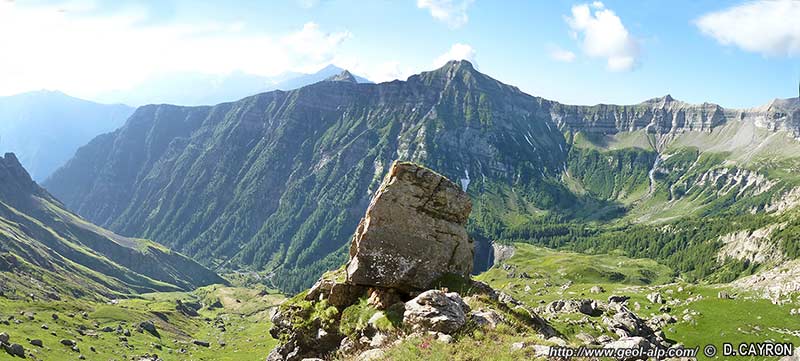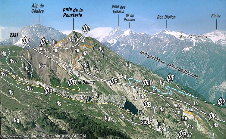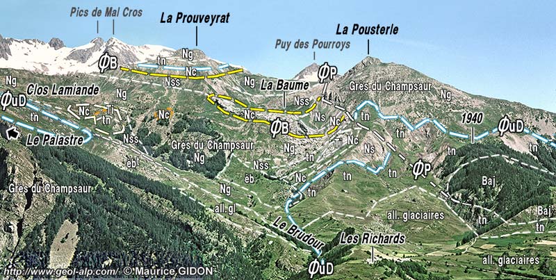 Les chevauchements complexes de La Pousterle prolongent en fait, de ce côté ouest du Champoléon, le dispositif décro-chevauchant de la faille de Méollion qui affecte le versant opposé. Il n'est donc pas surprenant que les complications de sa géométrie montrent que son fonctionnement a également dû avoir une histoire polyphasée. |