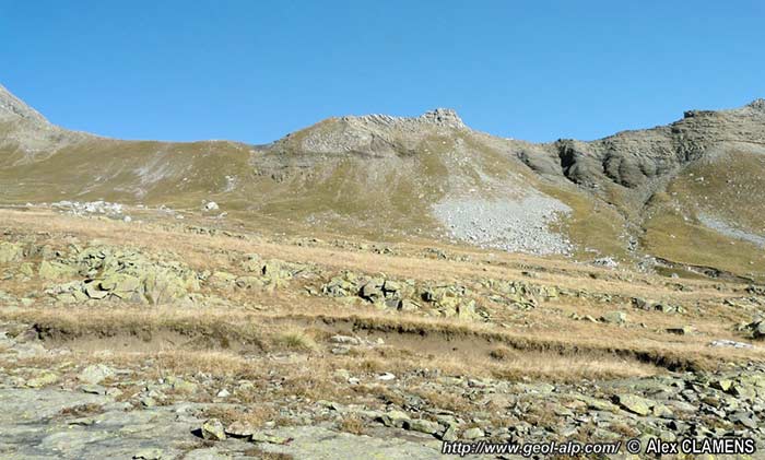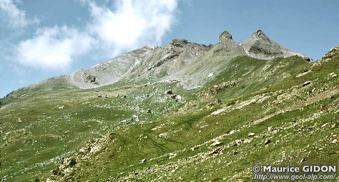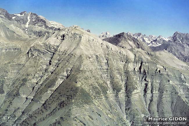 Le glacis de premier plan correspond sensiblement aux dalles structurales du sommet de la formation des grès du Champsaur : ses derniers bancs sont disloqués et recouverts par les schistes noirs de la formation olistolitique terminale ("Nol") et localement intriqués avec elle.