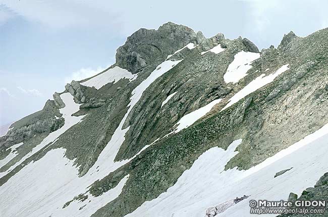 Le versant septentrional de la crête de Soleil-Bœuf, vu du nord depuis le pied de la crête sommitale du Vieux Chaillol, au dessus du col de Riou Beyrou (cliché original obligeamment communiqué par Mr. A. Clamens).