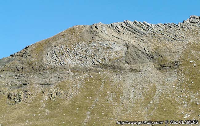 On distingue parfaitement la charnière anticlinale déversée