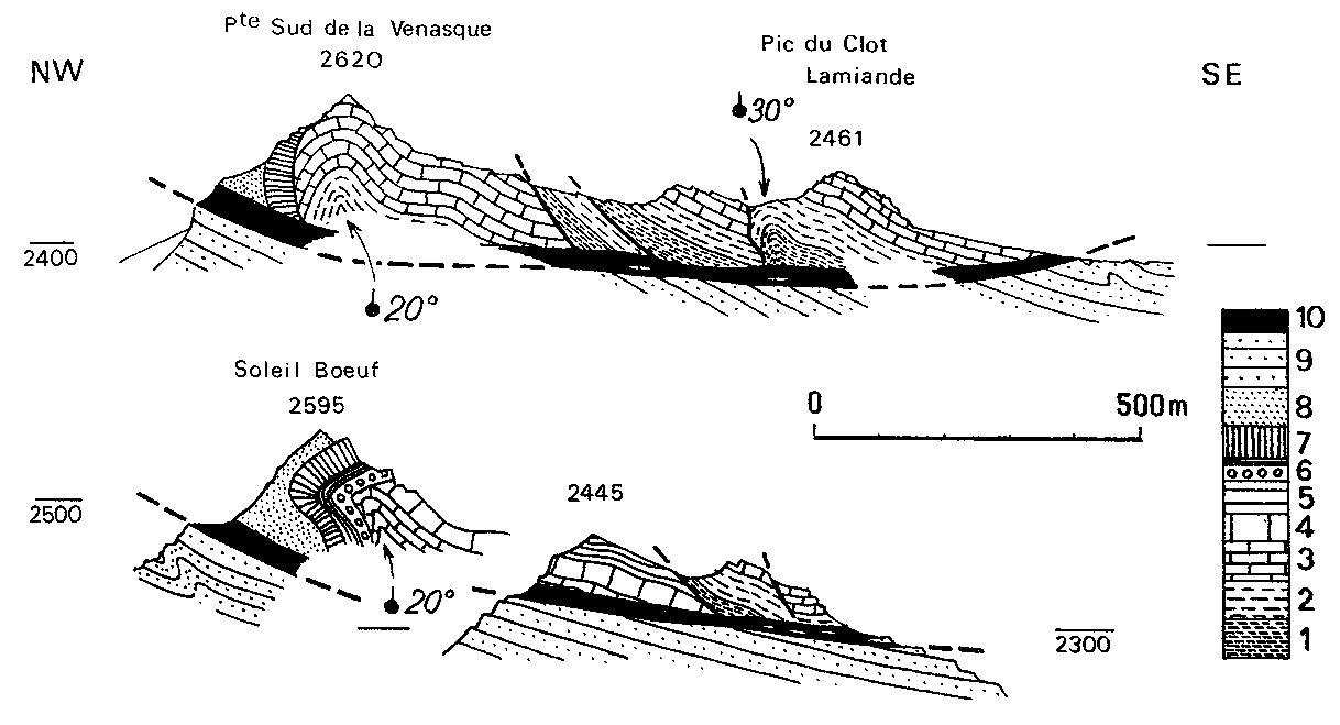 ultra-dauphinoise de Soleil Bœuf ; f.V = faille de la Vénasque (antérieure au charriage) ; DN = surface de discordance basale du