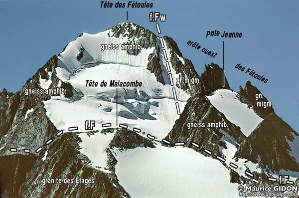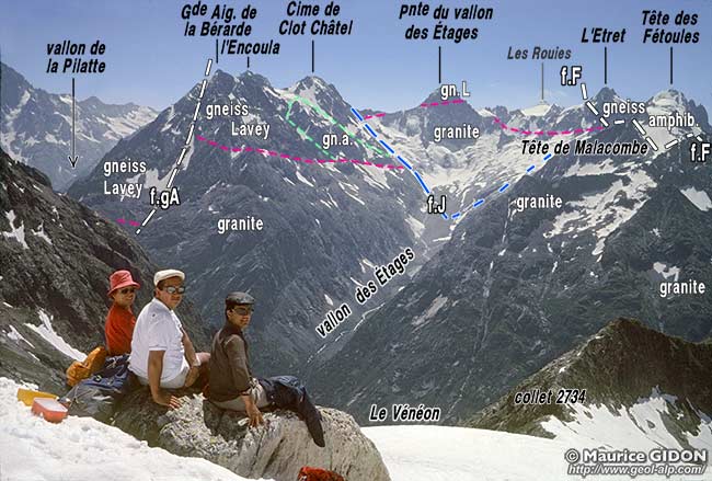 Du côté oriental le granite est simplement recouvert par des gneiss du type banal "de la Lavey" qui forment la crête de l'Encoula. Mais du côté ouest il est juxtaposé latéralement, par l'intermédiaire du faisceau de failles des Fétoules, à ces formations métamorphiques qui le recouvraient originellement. A l'ouest de cette faille elles forment la crête de L'Etret et des Fétoules et le plancher de ces roches est abaissé jusqu'en contrebas du lit du Vénéon (au niveau de Champhorent), c'est-à-dire certainement de plus de 2000 m ...