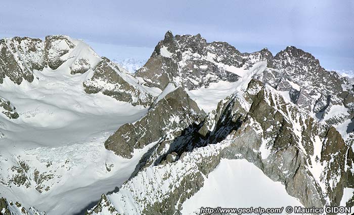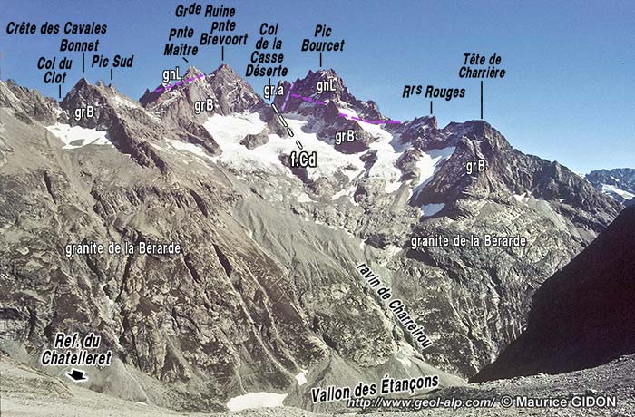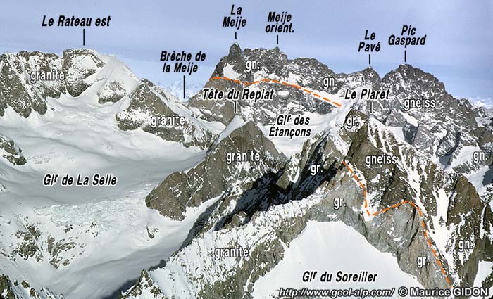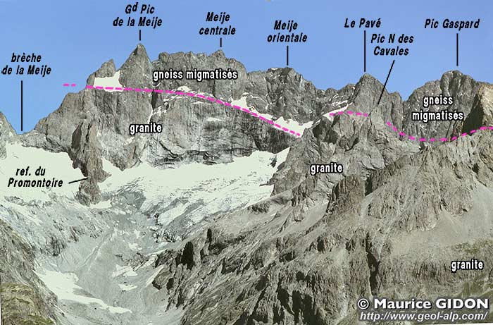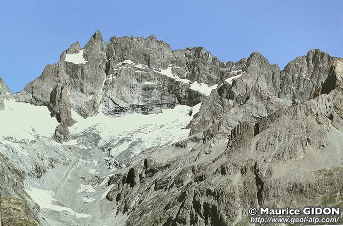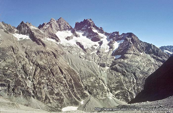Dans cette face sud la limite supérieure du pluton* granitique* de La Bérarde se repère aisément par une ligne de vires.