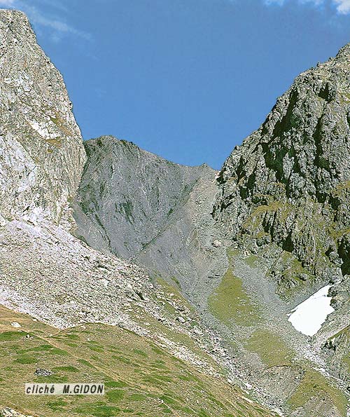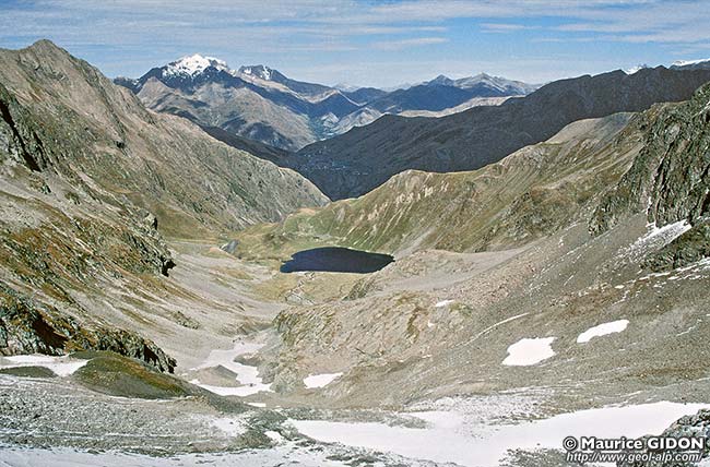 La partie médiane de l'ancien hémigraben jurassique, que drainent les ravins affluents orientaux du Torrent de la Pisse, s'épanouit également vers le sud (= vers l'amont) jusqu'à la latitude de la Cime du Pied de Bary et du fort épaulement transversal derrière lequel est retenu le lac de La Muzelle. Vers le haut son contenu de schistes domaro-toarciens prend un pendage de plus en plus fort vers le nord jusqu'à devenir plus fort que celui de la pente topographique moyenne, de sorte qu'il finit par laisser apparaître leur substratum de Lias calcaire réduit et de Trias adhérent aux gneiss du socle cristallin qui y affleurent à tour de rôle vers l'amont. Ce basculement vers le NW est un effet de crochon* induit par le chevauchement de la Muzelle (voir la page " Lanchâtra"), lequel vient s'amortir d'est en ouest dans ce secteur, environ 1 km au SE du lac de La Muzelle.
