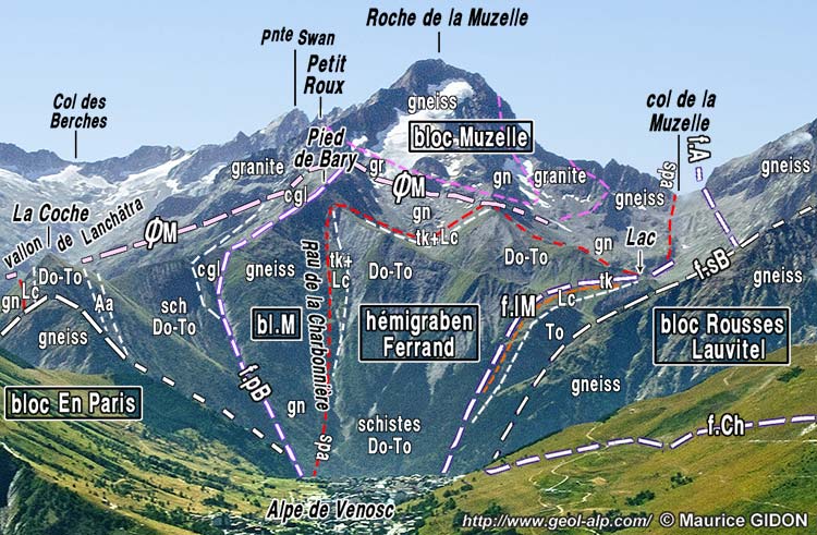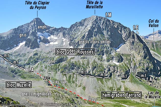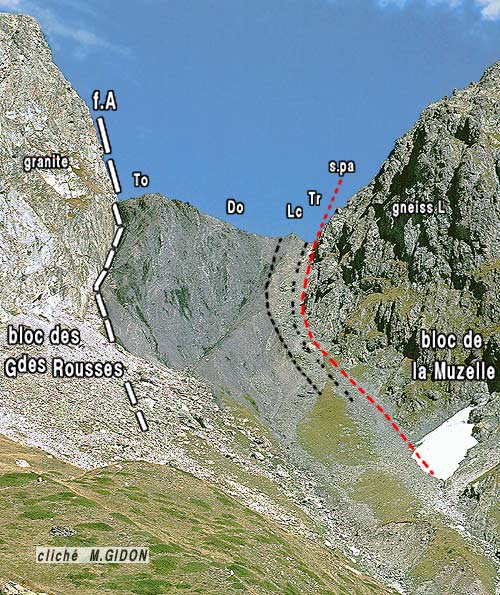 ![]() La rive occidentale du vallon de la Muzelle au sud du Lac (cliché original obligeamment communiqué par Mme D. Soyez) . f.A = faille d'Aspres ("m.f" = endroits où le miroir de faille, localement dénudé, montre apparemment qu'il pend vers l'arrière-plan) ; f.M = faille du pied de la Muraillette = cassure secondaire ouvrant une crevasse transversale dans la paroi séparant le bloc des Grandes Rousses de l'hémigraben du Ferrand) ; f.E = faille de l'Embernard (faille synsédimentaire transverse au bloc : voir la page "col du Vallon"). |