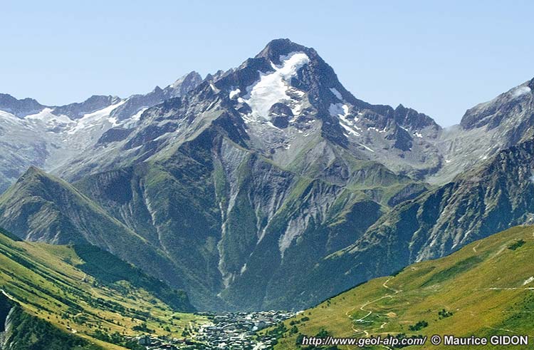 Ce dernier, qui se rattache du côté sud au bloc de la Muzelle, apparaît comme une subdivision occidentale du bloc majeur du Mont-de-Lans - En-Paris) : en effet son flanc ouest est garni par sa couverture sédimentaire normale, basculée à la verticale, tandis que son flanc oriental est tranché en biseau assez aigu par une surface qui supporte en abondance des témoins de matériel détritique liasique qui témoignent d'une dénudation synsédimentaire : on l'interprète comme la surface de cassure d'une faille du Pied de Bary.