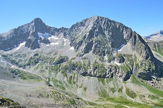 Mais ici, à la latitude de la transversale joignant à l'ouest à l'Aiguille de Venosc et à l'est à la Pointe de La Coche (sommets par lesquels culminent ces bordures gneissiques), la dépression sédimentaire est partagée en deux branches qui encadrent alors un bloc basculé secondaire du socle, celui du Pied de Bary.