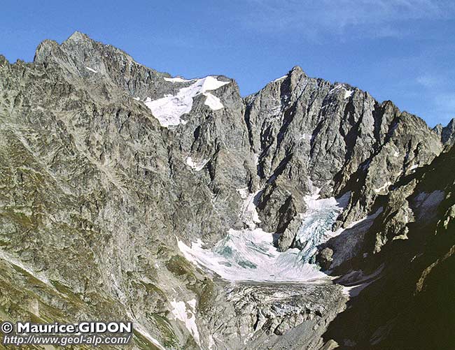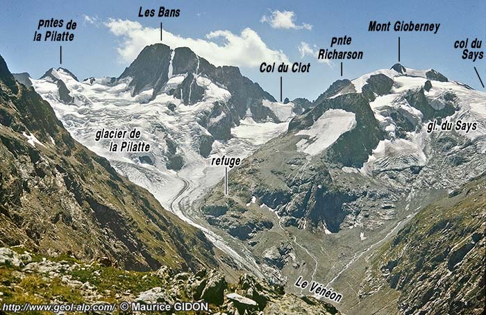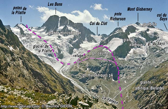 En fait le granite des Bans est assez différent de celui, de type albitique, qui forme la masse principale du grand pluton* de La Bérarde : il est de type monzonitique et a un grain plus fin avec une couleur plus verdâtre. La limite entre les deux passe au sud de l'arête orientale du Gioberney, sous la branche du glacier qui descend du col du Clot. |