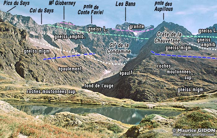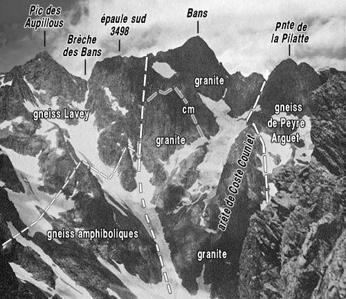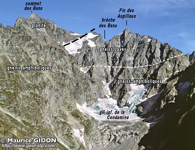 Du côté occidental de la crête N-S de la montagne, au niveau du ressaut qui soutient le fauteuil du glacier supérieur de la Condamine, le granite bute par une faille presque verticale contre les gneiss amphiboliques qui forment le soubassement du Pic des Aupillous.