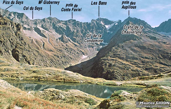 Vers le nord, dans les pentes occidentales de la Pointe de Conte Faviel et du Mont Gioberney, les gneiss amphiboliques affleurent très haut, jusqu'à proximité de la crête, qu'ils forment même au nord du col du Says. Le granite, par contre, n'affleure que sur le versant est de la crête, sauf à l'extrème sommet du Mont Gioberney (il s'agit d'ailleurs là d'une variété un peu particulière, grise et à deux micas) : il y est atteint à la faveur d'un rentrant qui échancre cette crête en direction de l'est en lui faisant recouper la faille occidentale des Bans.