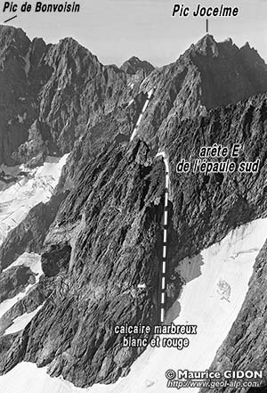![]() Les Bans : arête nord vue d'enfilade depuis le sommet du Gioberney. À gauche de l'épaisse lame granitique qui forme l'arête sommitale, le glacier de la Pilatte masque la faille bordière du linéament de Peyre Arguet - la Pilate, qui passe à droite de la Pointe de La Pilatte. À droite, les abrupts plus rocheux qui tombent sur le haut Valgaudemar et le Pic des Aupillous sont formés de gneiss (dont la partie basse est amphibolique). La faille qui limite le granite passe entre l'arête des Bans et le fauteuil du glacier supérieur de la Condamine. |
