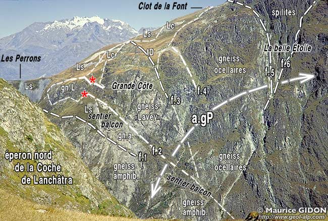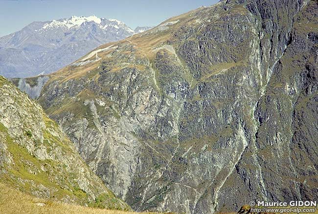 Dans les pentes relativement basses de ce versant, que traverse le sentier balcon de rive droite du Vénéon, l'examen de cette interface socle / couverture révèle des dispositifs structuraux