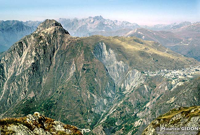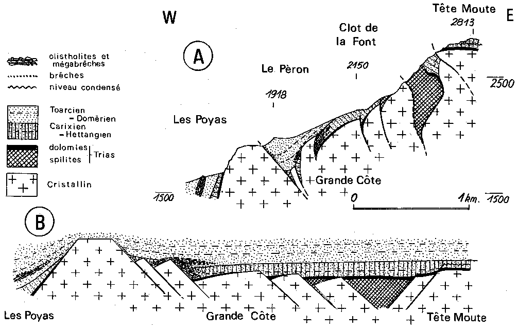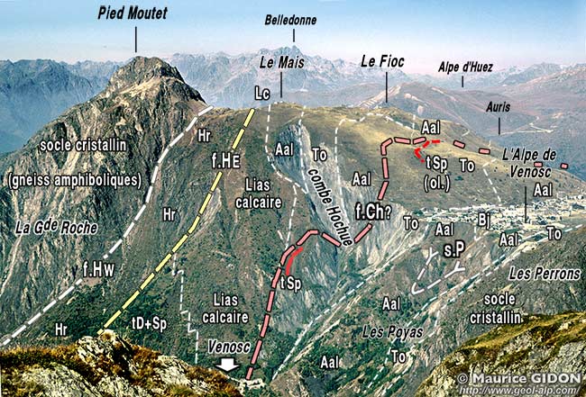 Si le matériel sédimentaire repose dans l'ensemble tranquillement, en succession stratigraphique normale et continue, sur le socle cristallin du versant oriental, il n'en est pas de même sur le versant occidental où les couches butent contre le cristallin de Pied Moutet par un systéme de cassures subverticales. Les plus orientales de celles-ci encadrent une bande de schistes houillers qui représente de façon très claire le prolongement méridional de celle de l'Herpie (voir la page "Alpe-d'Huez").