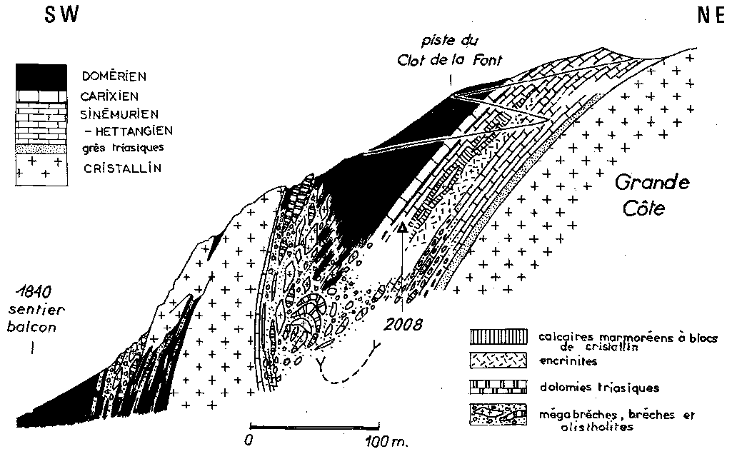 On y observe également, dans les pentes d'alpages du versant ouest de la station, des lames de brèches de Trias (spilites surtout) et de Lias calcaire qui représentent soit des olistolites soit des panneaux du garnissage du miroir de faille de l'accident du Chambon (?). |