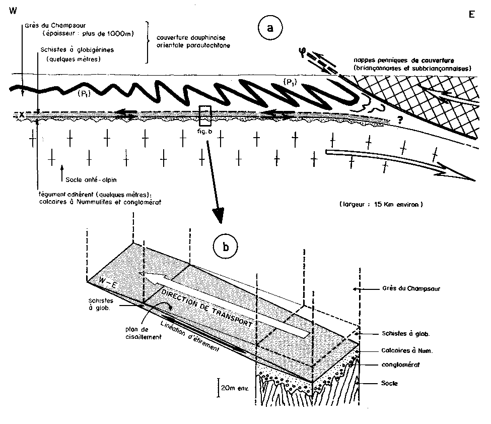 1/ Le socle cristallin est presque partout recouvert directement, en transgression, par la succession marine nummulitique, qui est sur la plus grande épaisseur constituée par la formation du "flysch des Aiguilles d'Arves" (qui passe vers le sud aux "Grès du Champsaur", fondamentalement similaires).