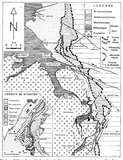 C'est ainsi que les "écailles" du secteur de l'Eychauda, dont les imbrications sont particulièrement bien visibles, se révèlent avoir eu un déplacement orienté vers le nord, avant que la flexion en voûte de la marge orientale du massif leur ait conféré un pendage qui semble les faire s'enraciner à l'est. D'autre part leur prolongement vers le nord, en direction du Lautaret, paraît bien difficile à soutenir et leur cachetage par le Nummulitique explique mieux la structure de la rive droite de la Guisane en amont du Monêtier.