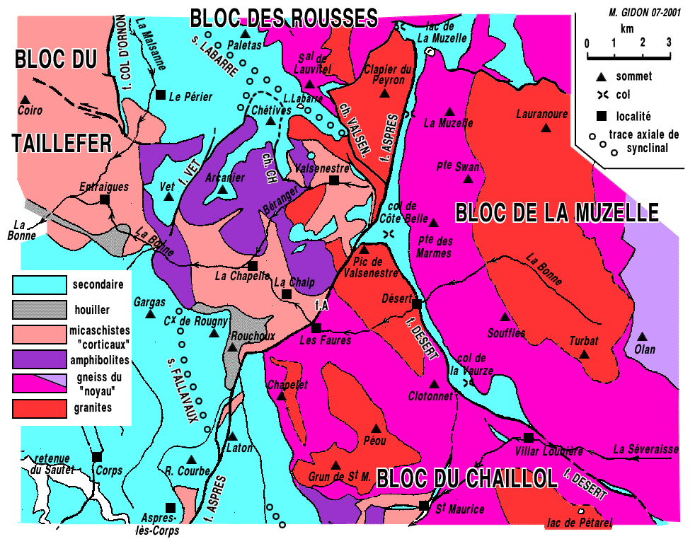 - La faille principale du linéament d'Aspres-lès-Corps : orientée NNE-SSW, elle traverse orthogonalement la vallée au village des Faures et se poursuit, au nord du Pic de Valsenestre, par l'accident du col de la Muzelle. C'est un accident qui joue un rôle majeur dans la structure tectonique des massifs cristallins externes, car il se poursuit depuis le Dévoluy, au sud, jusqu'en Beaufortain au nord (et sans doute au-delà), en constituant, au passage, la faille bordière orientale du bloc des Grandes Rousses.