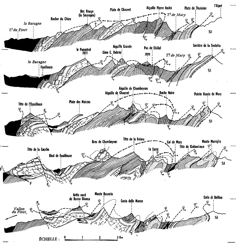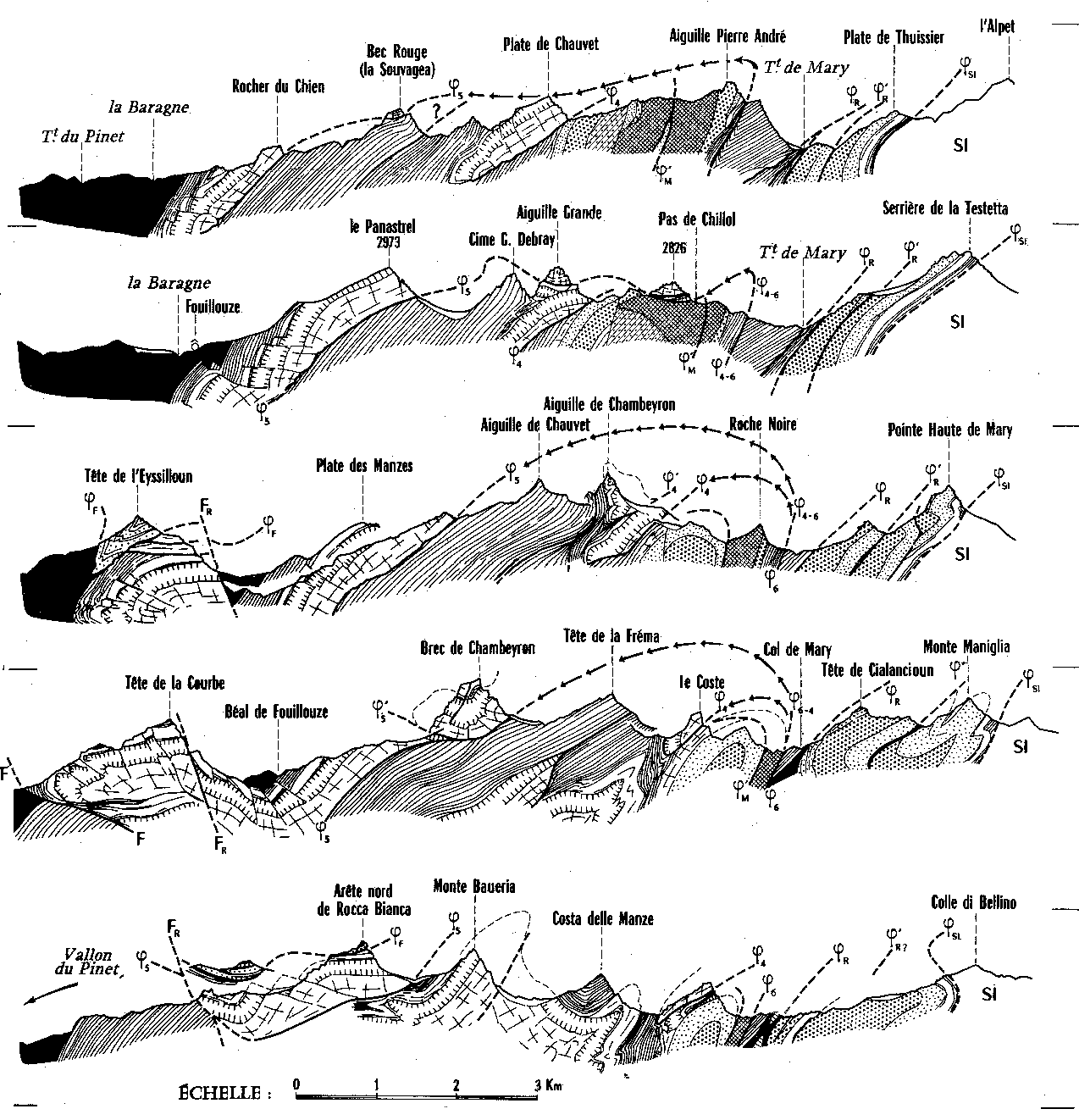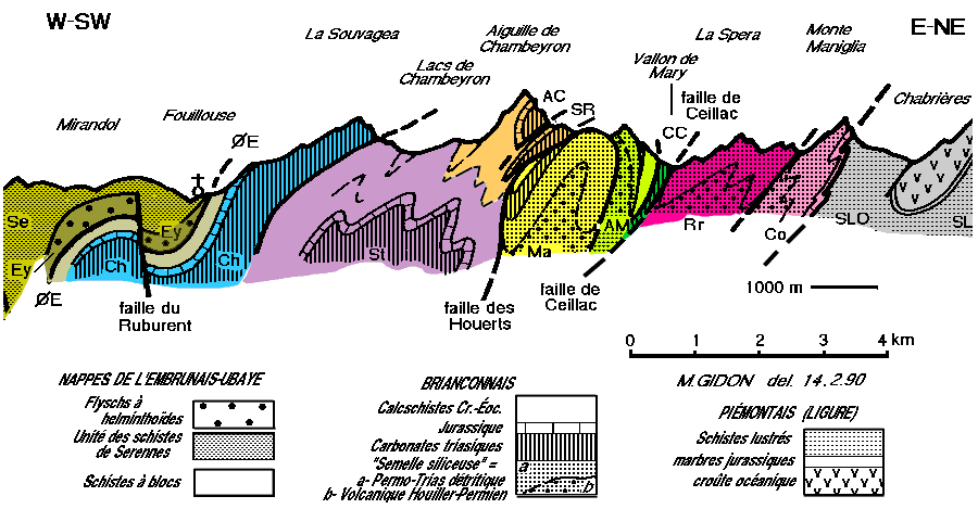 Toutefois, contrairement à une tentative d'interprétation ancienne (M.Gidon 1962), il paraît erroné, à la latitude de la coupe de l'Ubaye, d'interpréter de la même façon ce pli majeur comme un simple "anticlinal de nappes", enroulant des nappes antérieurement empilées, car il n'y a plus correspondance entre les unités des deux flancs de ce pli (voir la planche de coupe,s plus bas dans cette page).