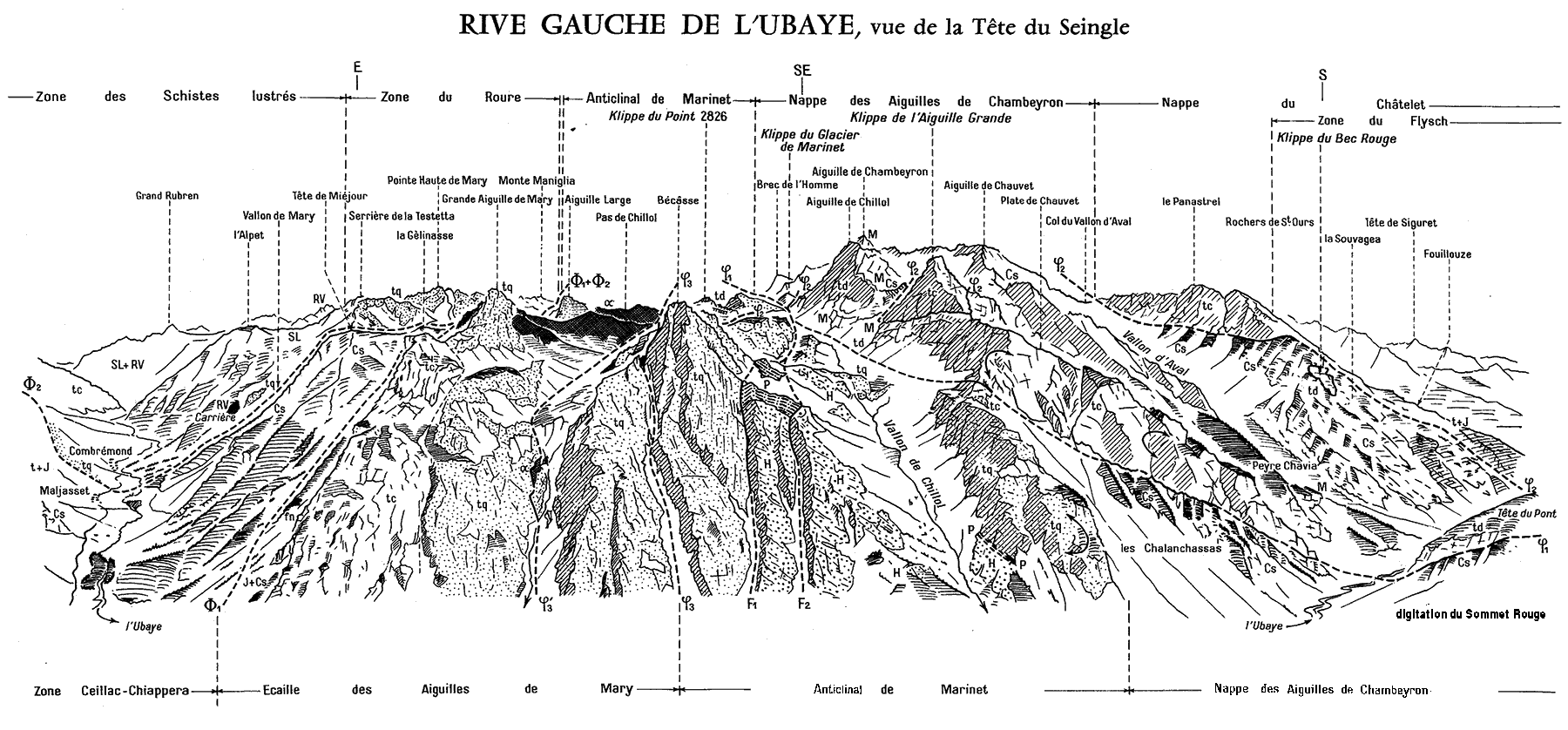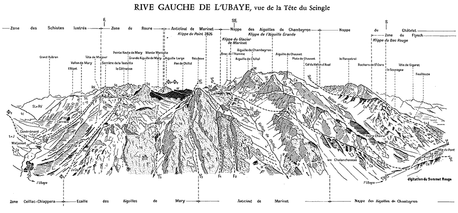 ![]() Panorama de la rive gauche de la gorge de la Haute Ubaye (croquis pris depuis la Tête du Seingle). NB : Le tracé Ø1, qui traverse la moitié droite de la figure, en diagonale descendante, se confond en partie avec celui de la faille des Houerts, qui le recoupe. Ce dernier accident, tardif, a un rejet de rétrocharriage, dont la vergence (vers la gauche) est indiquée par les charnières qui affectent les abords de la surface de cassure, notamment dans les abrupts encadrant les pentes des Chalanchassas. (extrait de la publication n° 024 , retouché) |