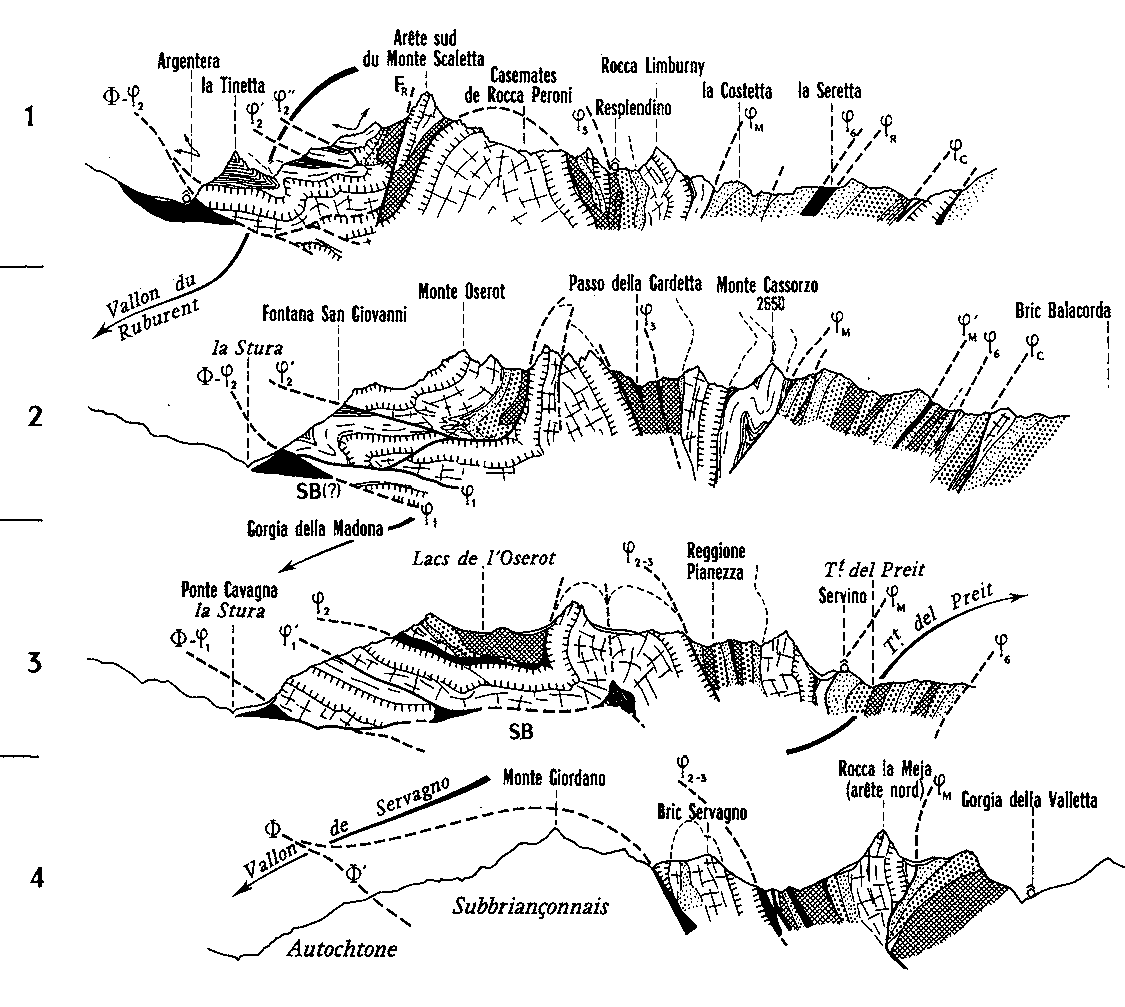 Coupes sériées à l'est de Bersezio, au travers des secteurs