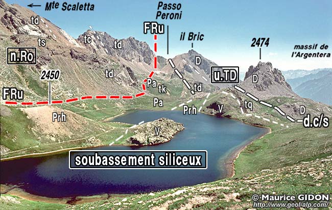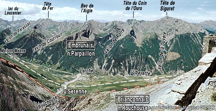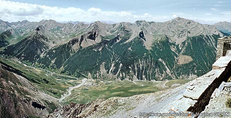 La vallée de l'Ubayette elle-même est un sillon structural que l'on peut comparer à une combe monoclinale* car elle est ouverte entre ces deux structures, en bordure sud-ouest de la bande de schistes noirs et gris de l'unité de Serenne**, qui s'y intercale et qui en a certainement dirigé le creusement. Ce sillon prolonge vers le sud-est la dépression du col de Vars et de Saint-Paul-sur-Ubaye et se poursuit en haute Stura (voir la page "Argentera") avec pour accidents les plus marquants à ces deux extrémités, la faille de la Durance au NW et celle d'Argentera au SE . Il jalonne en fait le tracé du linéament tectonique du Briançonnais occidental.