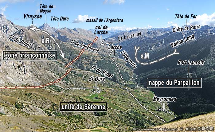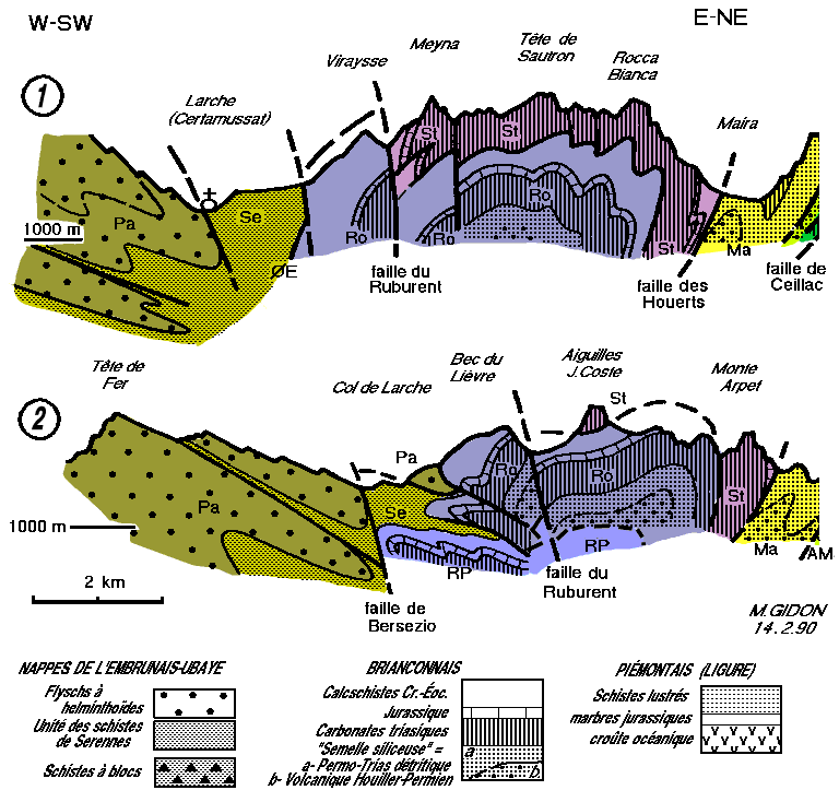 Ces coupes mettent en évidence un trait structural majeur qui se surajoute à la structuration par nappes empilées : les nappes de flysch de l'Embrunais sont conservées dans le synclinorium* de La Condamine (dont le pli le plus oriental est le synclinal de Meyronnes) et les nappes de la zone briançonnaise sont ployées ensemble par le vaste bombement anticlinal du Rouchouse ; il s'agit à l'évidence de méga-structures tardives postérieures aux charriages briançonnais mais aussi à ceux des nappes de l'Embrunais.