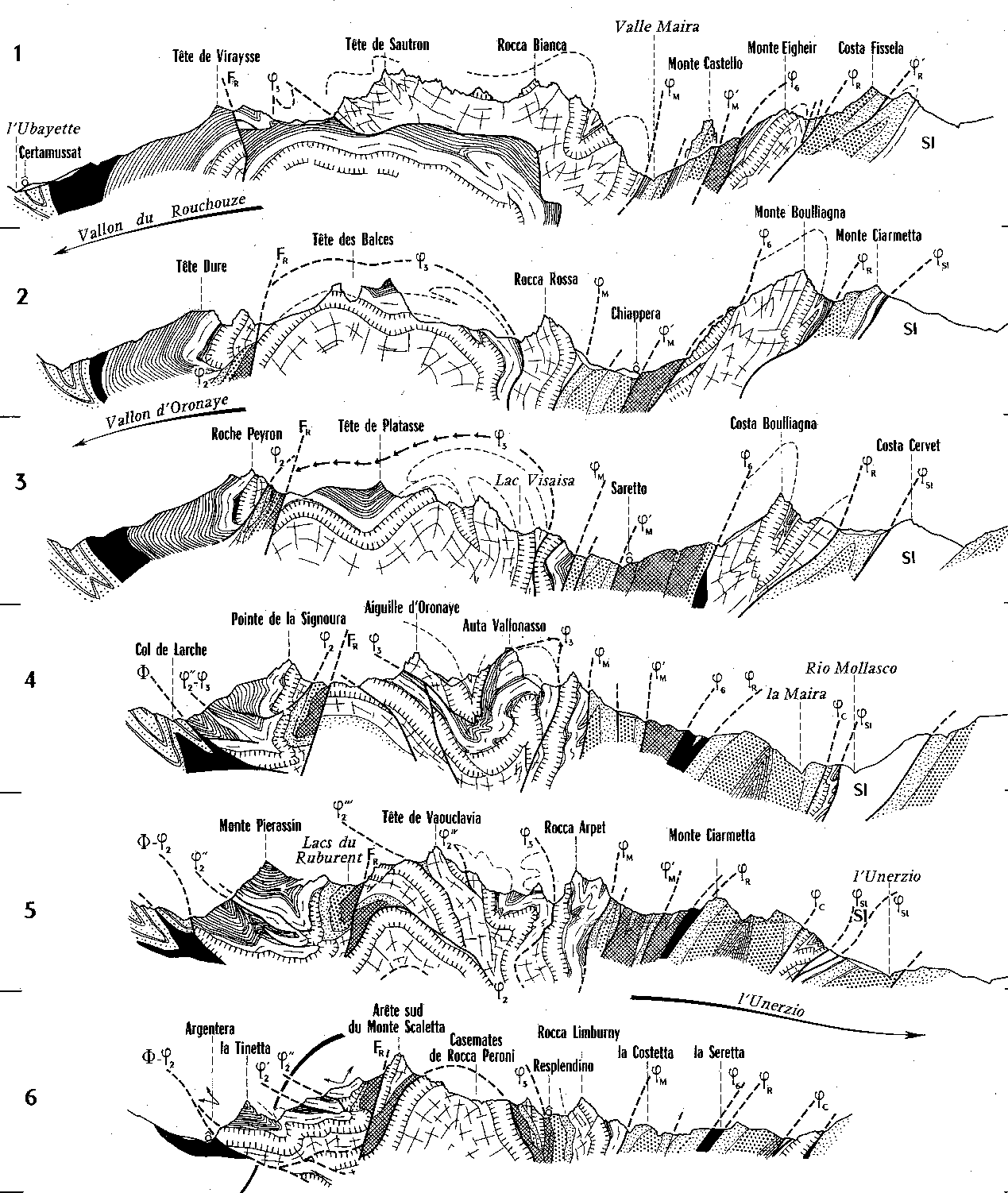 Coupes successives, du nord-ouest (en haut) au sud-est (en bas), au travers des chaînons entre Ubayette et Mairaextrait brut de la publication n° 024 (voir, dans les pages correspondantes du site, les versions retouchées). L'examen comparatif de ces coupes montre comment l'érosion