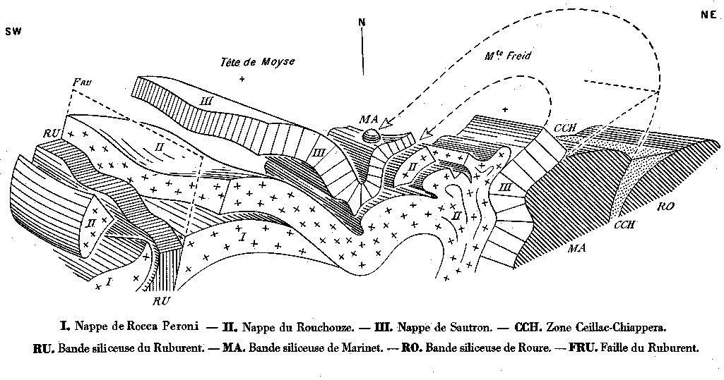En raison du sens de rejet de la faille du Ruburent (principalement étayé sur la coupe des Rochers de Saint-Ours), cette unité est sans doute à rapporter à la nappe du Rouchouse, soulevée par la faille par rapport à l'autre compartiment (et non à la nappe de Sautron comme admis dans la publication n° 024) : cette interprétation est d'ailleurs confirmée par la coupe naturelle que donne la transversale du Monte Oserot (voir la page "Oserot").