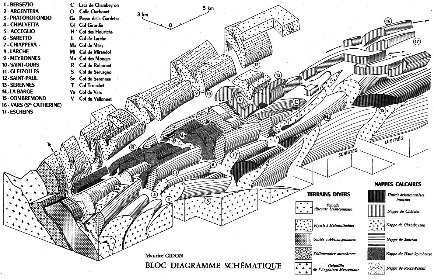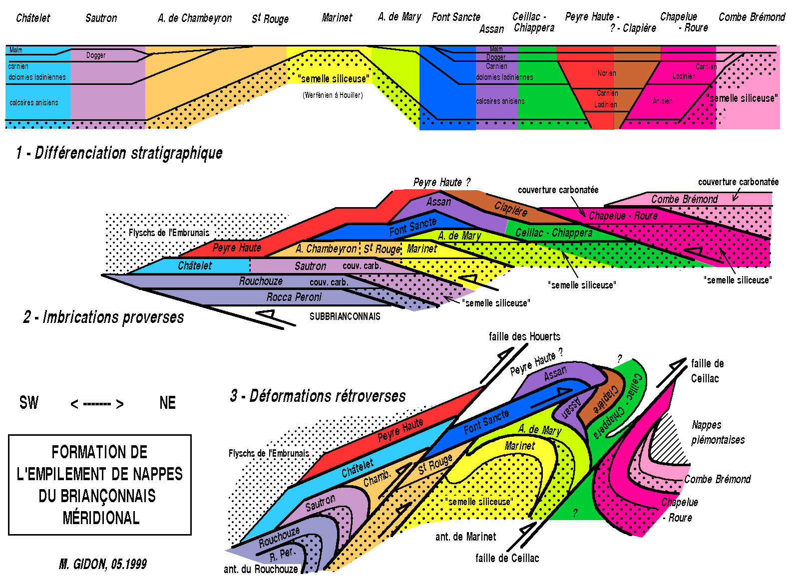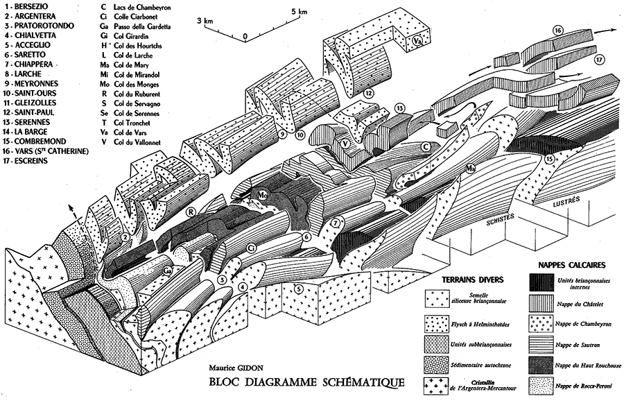 c) La réévaluation, à la hausse, du rôle des rétrocharriages remet enfin en cause les rapports entre diverses unités. Deux cas au moins sont à signaler : 1- La nappe des Aiguilles de Chambeyron était considérée comme provenant d'un domaine
