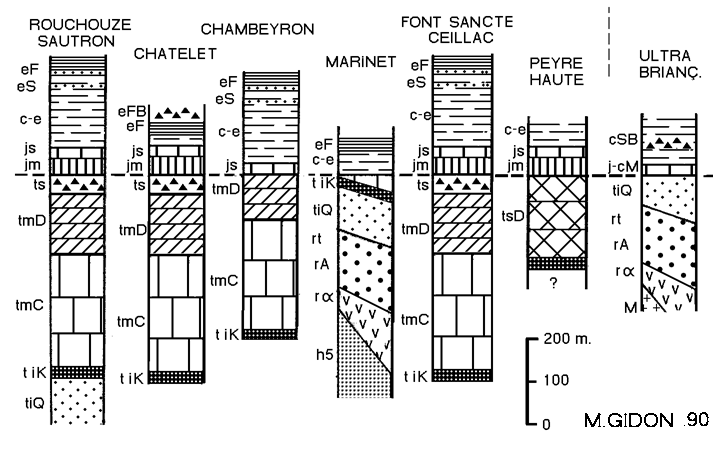 a) la constitution de la succession triasico-liasique, notamment par la présence ou non de termes du Trias supérieur, d'une part, et du Trias inférieur, d'autre part. Dans le cas le plus fréquent la succession ne comporte que des calcaires et dolomies du Trias moyen (Anisien-Ladinien), souvent couronnés par des schistes et brèches du Carnien inférieur.