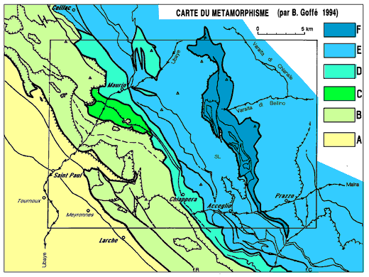 Carte schématique de la répartition du métamorphisme F = métamorphisme du faciès