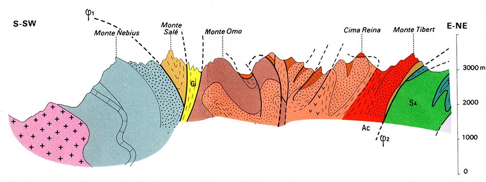 -en haute Stura, à l'Est de Sambuco, l'anticlinal du monte Nebius, plongeant vers le N.NE (rétrodéversement). Cette structure, connue plus au Sud-Est jusqu'au delà de la vallée du Gesso (Entracque) tout au long de la bordure nord de l'Argentera, semble dysharmonique par rapport au socle cristallin; elle intéresse également les unités allochtones et apparaît donc comme tardive (au moins par rapport aux phases principales de charriage du Briançonnais).