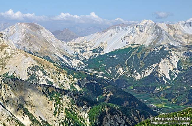 La vallée d'Arvieux, vue d'enfilade, du sud, depuis les abords du col de Souillet (au sud du Guil). |