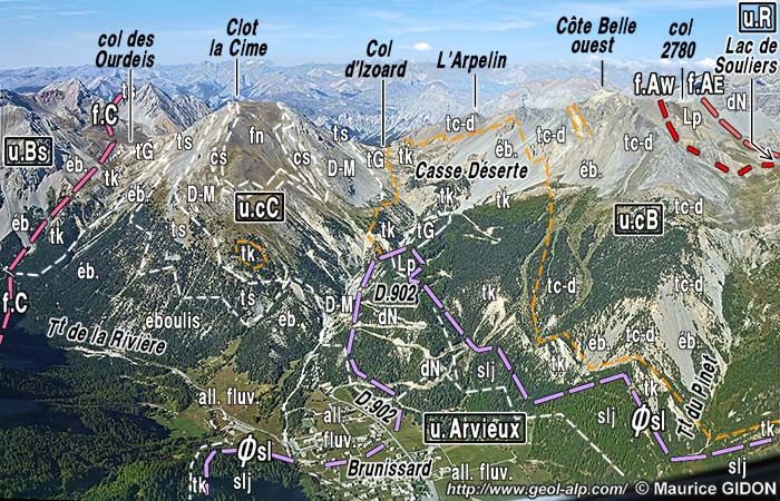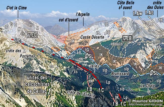 | Le versant méridional du col d'Izoard, vu d'avion, du SSE, depuis l'aplomb de La Chalp. Øsl = surface de chevauchement de l'unité piémontaise de schistes lustrés d'Arvieux ; u.Bs = unité du Pic de Baudouis ; u.cC = unité de Clot la Cime ; u.cB = unité de Côte Belle - Arpelin ; u.R = unité de Rochebrune. f.C = faille de Ceillac proprement dite ; f.Aw et fAE = failles ouest et est de Côte Belle (ce sont deux branches du prolongement méridional de la faille des Acles, elle-même constituant l'accident délimitant du côté est le "linéament briançonnais oriental"). Les tirets orangés limitent approximativement la zone gagnée par la cargneulisation, qui s'est apparemment propagée à partir des affleurements de gypse. "Lp" = Lias piémontais ; "slj" = calcschistes à lits de microbrèches (Jurassique moyen). |
