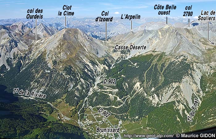 3/ En amont d'Arvieux, à Brunissard, le versant nord-oriental de la vallée de La Rivière est échancré par le raide vallon qui s'élève jusqu'au col d'Izoard. Le matériel de la klippe d'Arvieux s'engage dans sa partie basse et supporte les premiers lacets de la D.902. Plus haut, au sommet des bois (à l'altitude de 2100 : lieu-dit "Col de la Gypière") cette route s'engage dans l'épais coussin de cargneules qui s'intercale sous ce matériel et qui garnit la surface fortement pentée vers l'ouest de l'unité de Côte Belle.